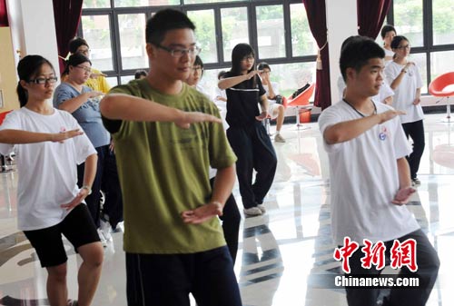 7月5日,32名參加“2010年海峽兩岸青年聯歡節·中醫藥傳統文化研習營”的臺灣高校學子在福建中醫藥大學福州旗山校區學練24式太極拳。
