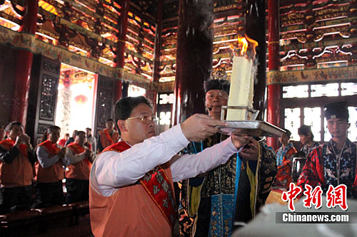 上午9時30分,朝拜進香儀式正式開始。伴隨著清澈的鐘鼓鳴奏,在一位身著傳統道教高功服道士的帶領下,來自臺灣的朝圣團成員紛紛焚香肅立,獻花、獻燭、獻茗、恭讀表文、焚表、擲筊……禮成鳴炮,撤班納福。