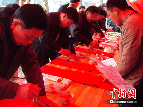 20日下午,海南省藝術(shù)家、書法獲獎?wù)吆团_灣書法家在文昌開展海峽兩岸書法家“送歡樂、下基層”義務(wù)揮春活動。(完)(張茜翼)