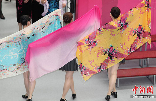 3月21日下午,由上海市婦女聯(lián)合會(huì)主辦的“花開(kāi)臺(tái)北·海派女性風(fēng)采展”在臺(tái)北開(kāi)幕,滬上112位杰出女性代表身著各式旗袍亮相花博會(huì)流行館,與相聚在此的臺(tái)灣婦女會(huì)總會(huì)姐妹們暢敘友情。圖為上海婦女代表團(tuán)成員現(xiàn)場(chǎng)表演絲巾秀。中新社發(fā) 符永康 攝