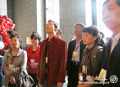 礙于篇幅筆者不想一一描述參觀的細節(jié),只記錄兩點作家的共同感受:感受一,原來寺廟還可以是這樣的!此話怎講?中臺禪寺帶給作家的絕不僅僅是宏偉壯觀產(chǎn)生的震撼,也不僅僅是工匠鬼斧神工的機巧,最重要的還是它傳統(tǒng)宗教與現(xiàn)代社會的有機融合。社會在發(fā)展,世界在進步,傳統(tǒng)古老的宗教如何跟上時代的腳步,中臺禪寺提供了一個成功的范例;感受二,接受了一次絕對是貴賓級的待遇。由于夏潮和王導預先作了聯(lián)系,寺方特意派出一位女師傅為大陸作家講解。憑著一張通行證,我們看到了一般游客看不到得光明殿、萬佛殿、藏經(jīng)閣,聆聽了細致的解說。若不是第五層有法事活動,我們幾乎看遍了所有的殿堂。憑這兩點共同的感受,大家回到車上,向夏潮和王導報以熱烈的掌聲就在情理之中了。