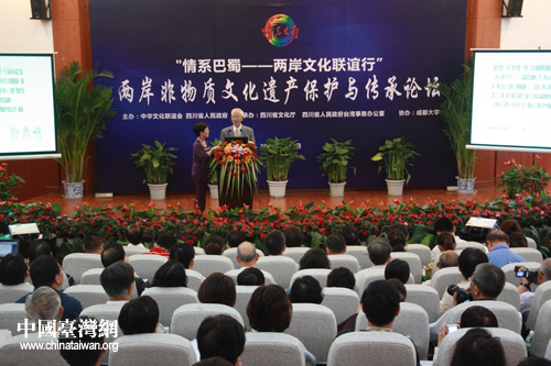兩岸非物質文化遺產保護與傳承論壇是“情系巴蜀 兩岸文化聯誼行”的重要活動之一,由前海基會副董事長焦仁和率領的95名臺灣文化、教育界人士出席論壇,與四川學者共議非遺保護與傳承。(記者 張瑞宸 趙輝)