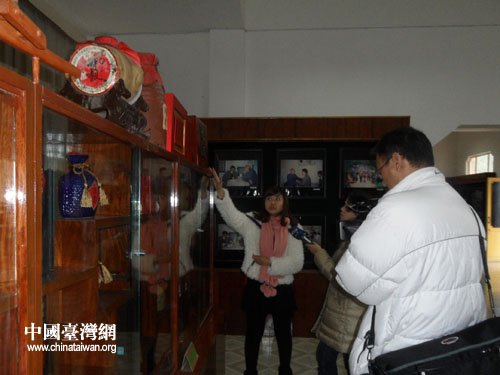臺(tái)灣記者在“酒鬼酒”展示館采訪,工作人員講解“酒鬼酒”文化。(圖片來(lái)源:湘西自治州臺(tái)辦)