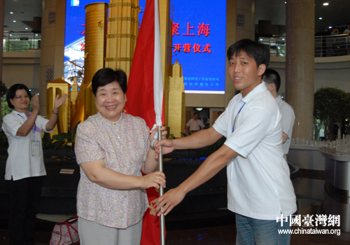 臺(tái)聯(lián)會(huì)長(zhǎng)林明月向營(yíng)員代表授旗。(上海市臺(tái)聯(lián) 朱征宇 攝)