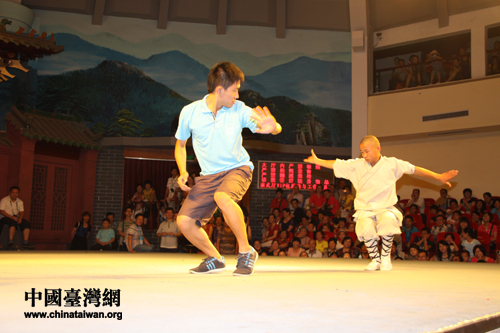 在互動表演環(huán)節(jié),來自臺灣嘉義大學學生陳逸瓏和陳彥百上臺進行模仿表演武術(shù)。雖然兩位同學并未完整地將動作做下來,但他們勇敢登臺表演、展現(xiàn)自身的表現(xiàn),贏得大家的陣陣掌聲。表演完后,陳逸瓏說,自認為有一定的身體素質(zhì),但真正要按照少林武僧的要求去做,真是太難了,差距也太大了,少林武功好個厲害。