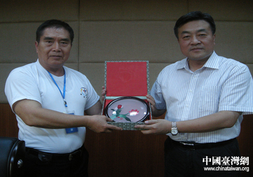 臺灣領隊陳蜀龍(左)和湖南文理學院黨委書記李民互贈禮品。(圖片來源:常德市臺辦)