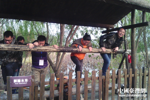 網(wǎng)媒記者們體驗(yàn)?zāi)_踏水車。(中國(guó)臺(tái)灣網(wǎng) 樊玉嬌 攝)