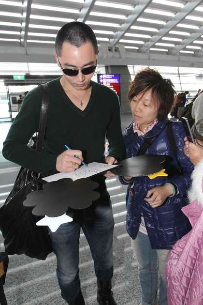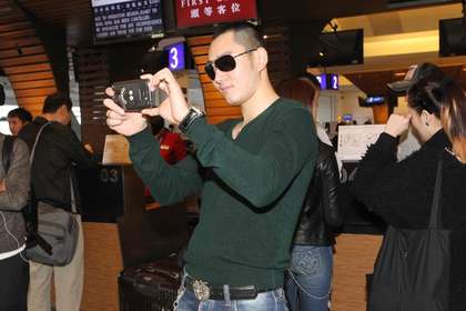 李東學搭機前,在機場大廳親切地幫等候已久的粉絲簽名留念,也相當親民,在機場大廳與粉絲合影留念,甚至拿起手機拍起前來送機的粉絲,還帶了相當多的臺灣名產回大陸。(中國臺灣網 焦源源)