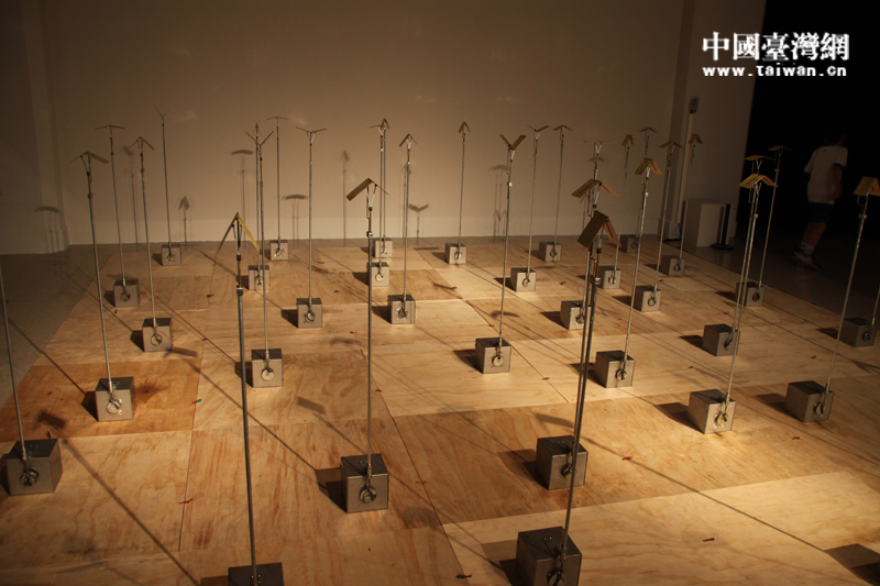 臺(tái)灣藝術(shù)家徐瑞憲的作品“旅行者之翼”用金屬、銅片、馬達(dá)、電線、變壓器、感應(yīng)器等制作,只要有人走近,金屬片就會(huì)煽動(dòng)象征車票般的翅膀,從而實(shí)現(xiàn)與觀者的互動(dòng),堪稱神奇。(中國(guó)臺(tái)灣網(wǎng) 蕪?fù)?攝)