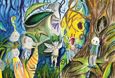 這個奇怪的天堂里有飛翔的兔子,也有準(zhǔn)備出航的水果們,還有躲在雨傘里的魚……皓茵小朋友,你是怎么想的?