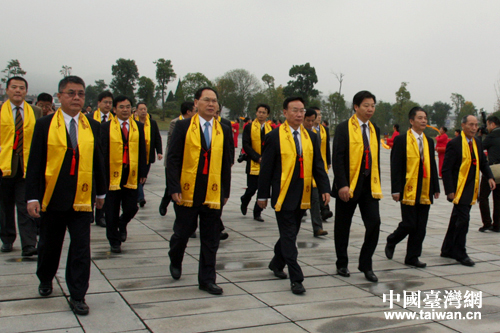 海協會副會長李亞飛代(左三)、湖南省省長助理袁建堯(左二),臺灣中華神農大帝協進會常務顧問、東莞臺商子弟學校董事長葉宏燈(左一)等兩岸相關負責人步入炎帝陵祭祀廣場。(中國臺灣 高斯斯 攝)