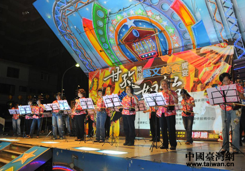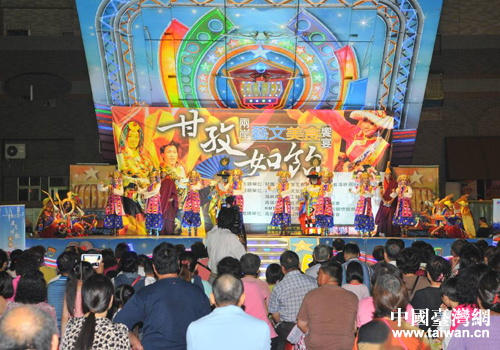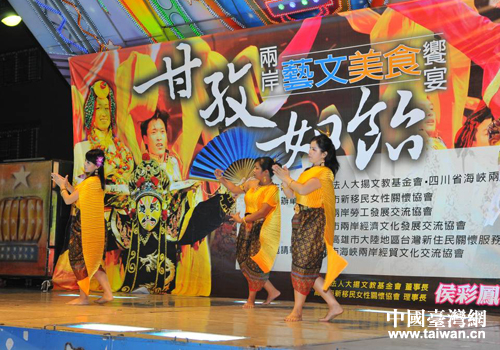 中國臺灣網(wǎng)11月13日高雄消息 日前,四川省民族歌舞赴臺交流團(tuán)第二場演出在臺灣高雄市三民區(qū)義民廟前的空地如約舉行。本場演出除了四川民族歌舞團(tuán)帶去的節(jié)目之外,臺灣同胞也上臺進(jìn)行了聲樂演奏、舞蹈等表演,兩岸同胞同樂。而演出場地一圈,還有數(shù)十個臺灣美食大排檔,當(dāng)?shù)厥忻癯丝梢孕蕾p文藝表演,也還可以品嘗到當(dāng)?shù)孛朗场?/p>
