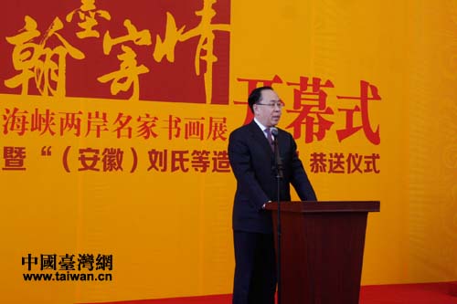 天津市武清區(qū)區(qū)委書記張勇在海峽兩岸名家書畫展暨“劉氏等造石佛塔”恭送儀式上致辭。(中國臺灣網(wǎng) 雍紫薇 攝)