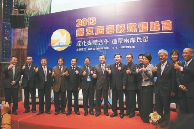 2013年11月,第五屆海峽媒體峰會在臺北舉行。峰會由福建日報社(報業集團)和臺灣旺旺中時媒體集團聯合主辦,以“深化媒體合作,造福兩岸民眾”為主題,深入探討兩岸媒體在新聞、經營等方面務實合作的新途徑,以及加強兩岸媒體產業合作的新思路。臺灣;鶗麻L林中森出席媒體峰會并表示祝賀。此外,與會代表還就兩岸媒體深化合作的項目及空間、兩岸媒體互設常駐機構的必要性與展望等議題進行交流研討。