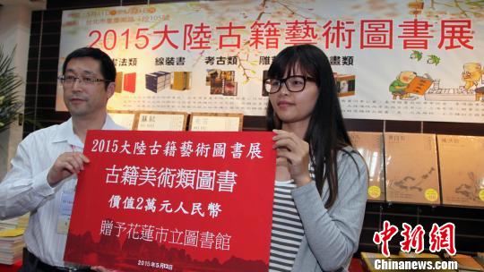 5月12日,2015大陸古籍藝術類圖書展大陸代表團團長崔曉軍(左)向花蓮市立圖書館贈送了天津楊柳青畫社在內多家出版社《中國畫技法》等一批古籍美術類圖書!⑹媪琛z