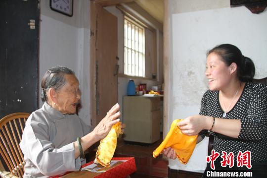 沈阿婆向晚輩展示自己做的“神衣”。 朱少文 攝