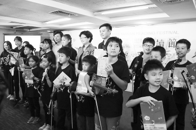 在閱讀節上,臺北市士東小學弦樂團的孩子們獲贈精彩的童書。
