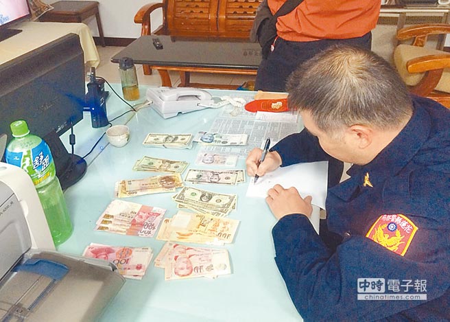 新城警方一一清點良心司機拾獲的一袋外幣,發現幣值高達新臺幣17萬元,并通報警廣協尋失主。圖片來源:臺灣中時電子報