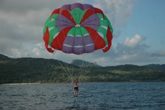 臺灣民眾喜愛旅行東南亞島嶼,這些海島度假區(qū)大多擁有漂亮的沙灘,湛藍的海水和迷人的艷陽藍天,墾丁三者兼具,也是很適合親水的海濱度假勝地。海外海島常見的海上拖曵傘活動,在墾丁也有機會體驗,而且是難度較高的海上船舶起降。游客隨著拖曵傘緩緩升到空中,墾丁山海和聚落景觀盡收眼底。