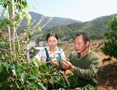 11月3日,在福建南靖縣南坑鎮(zhèn)“漳州天綠(南坑)咖啡基地”,技術(shù)員(右)正在向女員工傳授咖啡掛果管理技術(shù)。臺商黃文廣先生投資500萬美元,選擇在福建南靖縣南坑鎮(zhèn)創(chuàng)建“漳州天綠(南坑)咖啡示范基地”,經(jīng)2年多的努力,現(xiàn)已建成福建省首個臺灣百畝咖啡觀光園和首個臺灣咖啡種植示范基地,帶動當(dāng)?shù)剞r(nóng)民種植良種咖啡400多畝。計劃在3年內(nèi),全縣建成5000畝臺灣咖啡示范基地,配套建設(shè)咖啡觀光休閑中心、咖啡加工廠等項目。