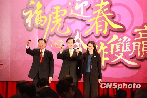 2月22日,“2010大陸臺商春節聯誼活動”在臺北圓山大飯店舉行,100多位大陸各地的臺商會長與會。圖為國民黨主席馬英九、臺灣;鶗麻L江丙坤、臺灣“陸委會”主委賴幸媛在主席臺上為臺商敬酒,祝賀大家新年虎虎生風、萬事順利。中新社發 閆曉虹 攝