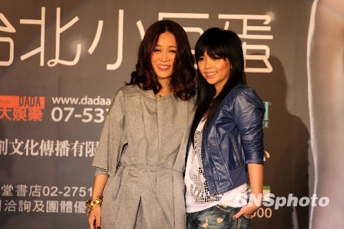 5月25日下午,大陸“情歌天后”那英“那20年世界巡回演唱會”臺北記者會舉行,臺灣“小天后”張惠妹(右)現(xiàn)身為好友站臺。董會峰 攝