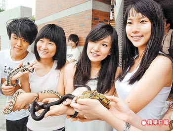 中國臺灣網(wǎng)6月16日消息 據(jù)臺灣《蘋果日報》報道,“。W(xué)校里有蛇!”臺南縣歸仁鄉(xiāng)長榮大學(xué)校內(nèi)昨驚叫聲連連,原來是企管系大四男生卓佳逸帶來18條寵物蛇,秀給同學(xué)試膽。