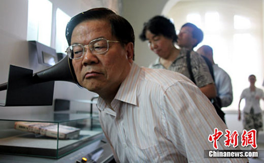 9月8日,中華文化聯(lián)誼會名譽會長蔡武在臺南市訪問臺灣文學館。圖為蔡武試聽以荷蘭語節(jié)錄的“熱蘭遮城日記”。中新社記者 劉舒凌 攝