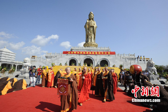 浙江普陀山上的巨大觀音圣像一直是佛教信眾們的心靈家園,這里金沙環繞,與宛若佛陀橫臥的珞珈山隔海相望。17日上午,該圣像之下,整齊地擺放了千尊觀音金身佛像,在普濟寺方丈道慈法師和來自臺灣高僧大德主持下,一場為即將遠赴臺灣的千尊觀音圣像開光儀式顯得格外隆重。