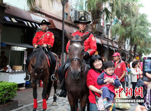 11月3日,每逢節(jié)假日,在臺(tái)北縣的旅游點(diǎn)鶯歌鎮(zhèn),穿著紅色牛仔服的臺(tái)北縣警察局騎警,總是能吸引游客爭著與其拍照。 中新社發(fā) 記者 陳立宇 攝