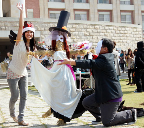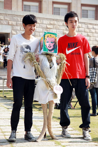據報道,亞洲大學創意設計學院22日舉辦一場別開生面的稻草人選美走秀活動。院長賴淑玲表示,“稻草人也可以很酷,很漂亮”,學校附近很多稻田,秋收后,常見稻田中孤單稻草人,2010年特別在11月底發動學生撿拾稻草回來曬干,并制作稻草人,利用學生創意把稻草人變美了。