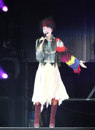 據(jù)報道,配合冷冷的天氣,演唱會的開場舞臺以冷色調(diào)登場,王菲也一身白裝,白色頭套、配上一襲全白洋裝,左眼還頂著銀黑色眼罩,像是雪中精靈在臺上飛舞。