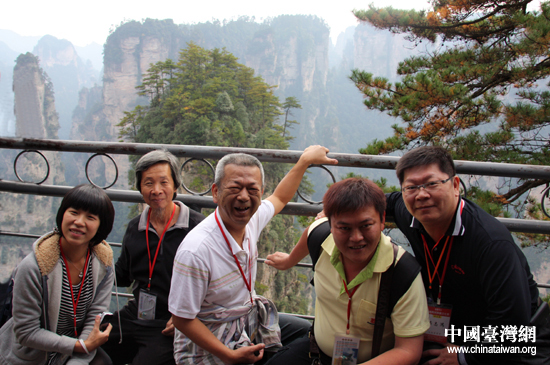 臺灣嘉賓于電影《阿凡達(dá)》哈利路亞懸浮山的原型山——乾坤柱前興奮合影。(中國臺灣網(wǎng) 王思羽 攝)