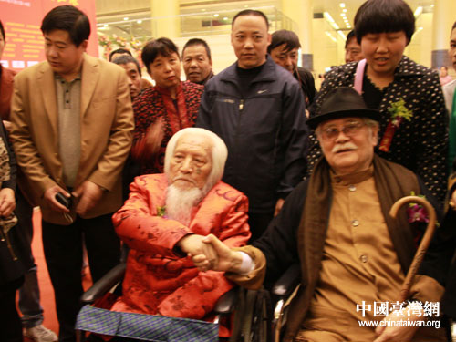 臺(tái)灣中華書院院長(zhǎng)李奇茂(右)、著名書畫大師孫大石(左)出席開幕式。(圖片來(lái)源:山東省臺(tái)辦)