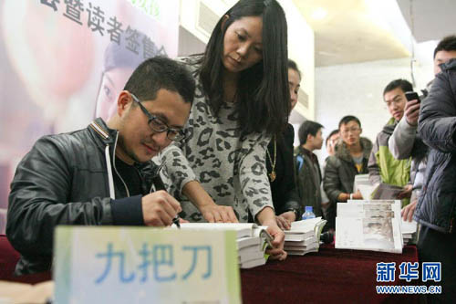 1月11日,臺灣知名網(wǎng)絡(luò)文學(xué)作家九把刀(藝名)在北京西單圖書大廈為讀者簽名。當(dāng)日,《那些年,我們一起追的女孩》新書簽售活動在北京舉行。作者九把刀本名柯景騰,被譽(yù)為臺灣網(wǎng)絡(luò)文學(xué)的領(lǐng)軍人物。其自傳體小說《那些年,我們一起追的女孩》講述了作者九把刀的一段青春往事。根據(jù)小說改編、由九把刀親任導(dǎo)演的同名電影于1月6日登陸內(nèi)地市場,受到觀眾熱捧。新華社記者 張帆 攝