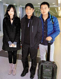 導演張藝謀(圖中),昨率演員倪妮(圖左起)、佟大為來臺宣傳3月2日上映的電影《金陵十三釵》。(攝影/高興宇)