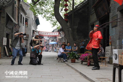 兩岸攝影家在周村古商城采風(fēng)拍攝,圖為90歲高齡老藝人現(xiàn)場(chǎng)表演。(圖片來(lái)源:淄博臺(tái)辦)