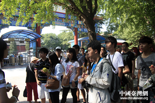 中國臺灣網(wǎng)8月10日北京消息 “啊,原來你們也看康熙哦”,“是啊,在網(wǎng)上就能看到”,“奇怪耶,原來你們的七用手勢比是這樣的,我們好不一樣哦”……從娛樂到生活,從臺北到北京,同為“90后”,年紀(jì)相仿的兩岸學(xué)子們一見如故,相談甚歡。8月9日當(dāng)天,在大陸志愿者的陪同下,臺灣青年學(xué)生交流團走進北京的大街小巷。雍和宮、國子監(jiān)、南鑼鼓巷、后海,這里的點點滴滴都記錄下了同學(xué)們留戀的背影,見證了兩岸學(xué)子溝通交流的美好時刻。