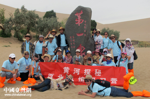 “黃河探秘—西北風情研習營”全體營員在月牙泉邊合影留念。(中國臺灣網 張潔 攝)