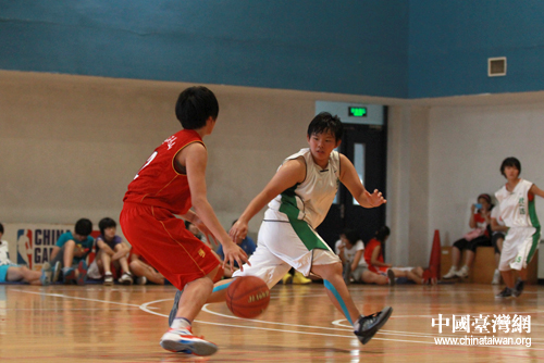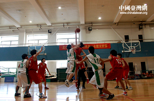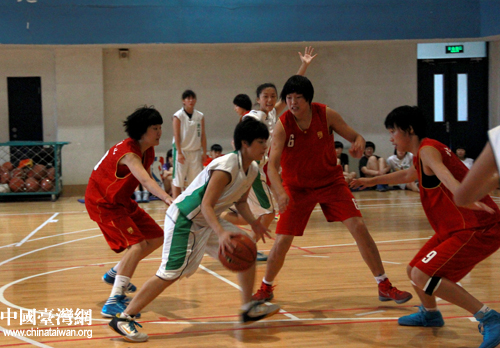24日下午,北京青年女籃與臺(tái)灣臺(tái)北女子第一高中女子籃球隊(duì)展開(kāi)一場(chǎng)跨越海峽的友誼賽。圖為雙方隊(duì)員在場(chǎng)上激烈爭(zhēng)奪。(中國(guó)臺(tái)灣網(wǎng) 普燕 攝)