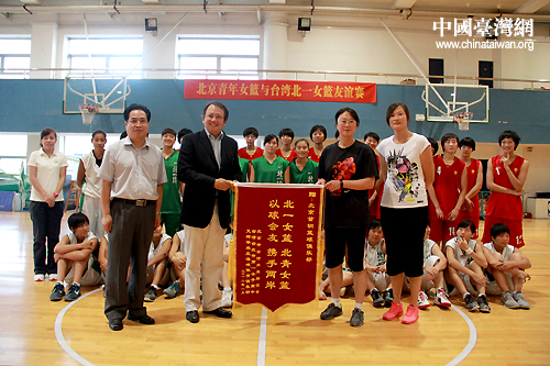 24日下午,北京青年女籃與臺(tái)灣臺(tái)北女子第一高中女子籃球隊(duì)在首鋼籃球中心展開(kāi)一場(chǎng)跨越海峽的友誼賽。賽后,北京市臺(tái)聯(lián)、艾荷華農(nóng)莊海峽體育俱樂(lè)部和灣臺(tái)北第一女子高中籃球隊(duì)聯(lián)名向北京首鋼籃球俱樂(lè)部贈(zèng)送錦旗。(中國(guó)臺(tái)灣網(wǎng) 普燕 攝)