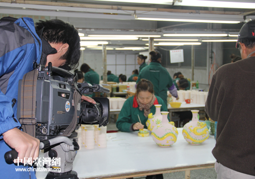 攝制組拍攝特色陶瓷制作工藝。(圖片來源:棗莊市臺辦)