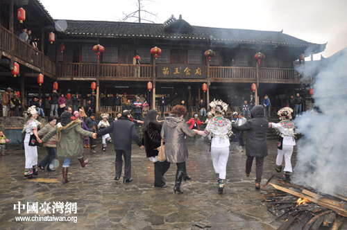 參訪團與當?shù)厣贁?shù)民族聯(lián)歡。(圖片來源:松桃縣臺辦)