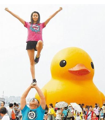 大四女學生戴麗絲以拉拉隊技法與小黃鴨合影,讓人嘆為觀止。(圖片來自臺媒)