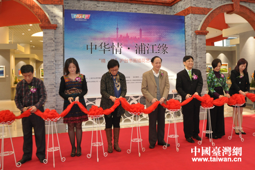 首屆“中華情、浦江緣――‘精 美’滬臺書畫插花藝術展”在上海開幕,兩岸嘉賓為藝術展開幕剪彩。(上海市臺協 玉龍 攝)