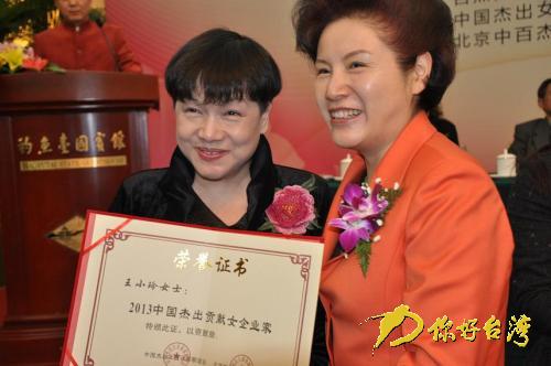 全國婦聯副主席、書記處書記孟曉駟為香港知名老字號“詠藜園”女當家、王小玲董事長頒發“2013中國女企業家杰出貢獻獎”。(你好臺灣網 圖)