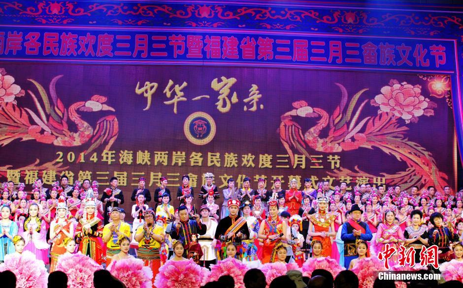 4月2日是中國農歷三月初三,2014海峽兩岸各民族歡度“三月三”節暨福建省第三屆“三月三”畬族文化節在福建福鼎市開幕,兩岸少數民族音樂舞蹈相繼展示上演,近千名少數民族同胞共聚于此,歡慶“三月三”。此次文化節由中華民族團結進步協會、福建省海外聯誼會、福建省少數民族發展基金會、福建省閩臺交流協會、寧德市中華畬族宮協會、中華畬族文化與慈善基金會共同主辦。圖為開幕現場。(中新社發 呂巧琴 攝)