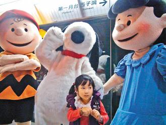 史努比、查理布朗以及露西等玩偶現身彩繪列車,小朋友開心地與玩偶一起搭高捷。(記者謝梅芬 攝影)