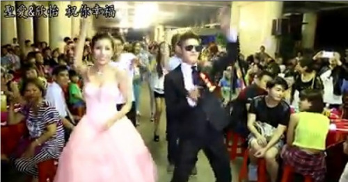 據報道,這對“動感新人”帶領著伴郎伴娘群大跳進場舞,原本已經餓到沒力的賓客立刻high起來,全都擠到前方準備錄像,準備上傳臉書。其中還有一位孕婦不顧大腹便便,就是要卡在第一位,好把畫面記錄下來。