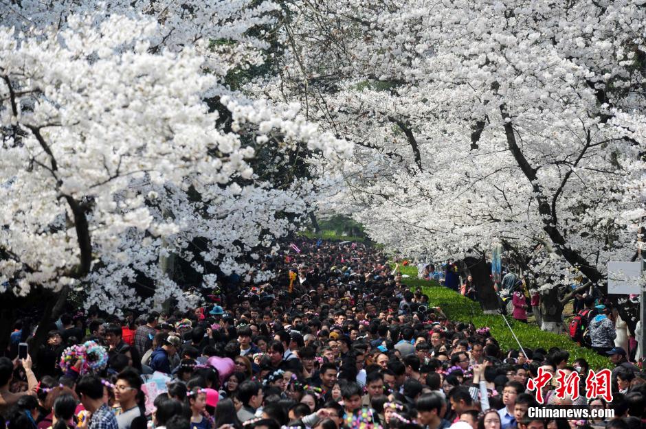 3月21日,武大櫻花盛開游客如織。當日,武大櫻花盛開的首個雙休日。長約200米的櫻花大道上1000多株櫻花競相綻放,吸引著數萬游客,使寧靜的校園變成了熱鬧的公園。中新社發 張暢 攝